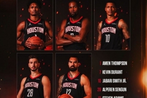 本场火箭排出了一套“五大”首发:阿门、杜兰特、小史密斯、申京、亚当斯。